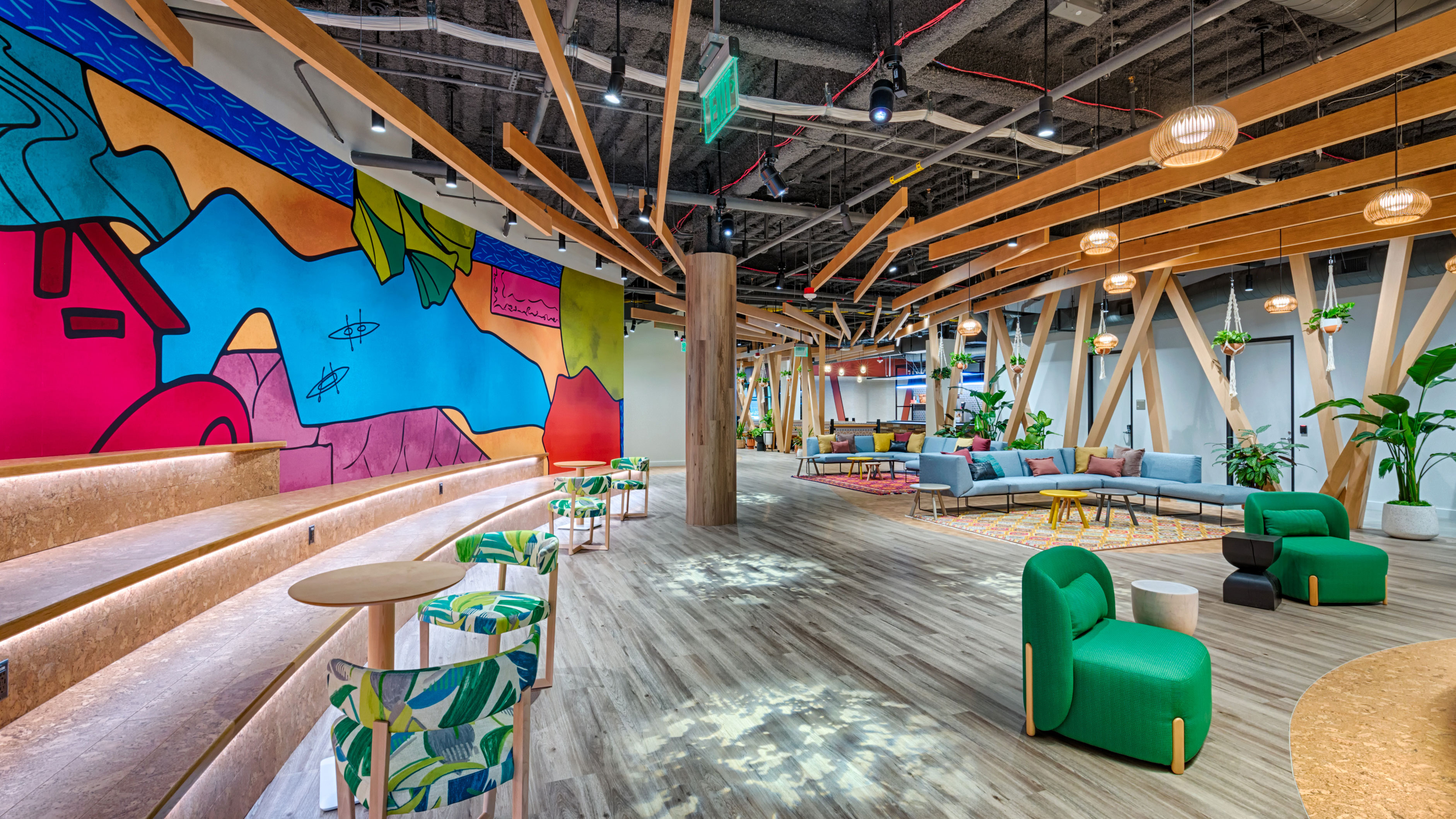 To foster a sense of cohesion throughout the campus, each building was divided into four workplace quadrants (red, blue, yellow, and green). The glass graphics in each quadrant were designed to maintain a cohesive feel across the campus while also reflecting each building's unique identity. In this instance, the design of the glass graphics highlights the root systems and flowers native to San Jose.